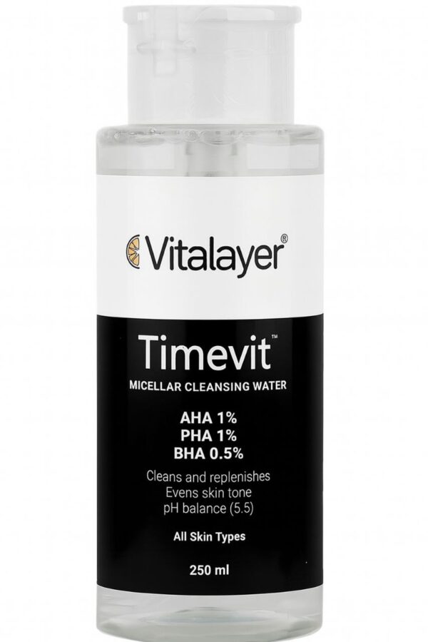 محلول پاک کننده میسلار واتر تایم ویت ویتالیر یکی از انواع میسلار واتر ویتالیر، محصولات ملایم و موثر برای پاکسازی پوست با لایه برداری ملایم در بسته بندی طوسی- مشکی است. میسلار واتر ویتالیر مشکی حاوی ترکیبات مختلفی است که به بهبود و شفافیت پوست کمک می‌کند.