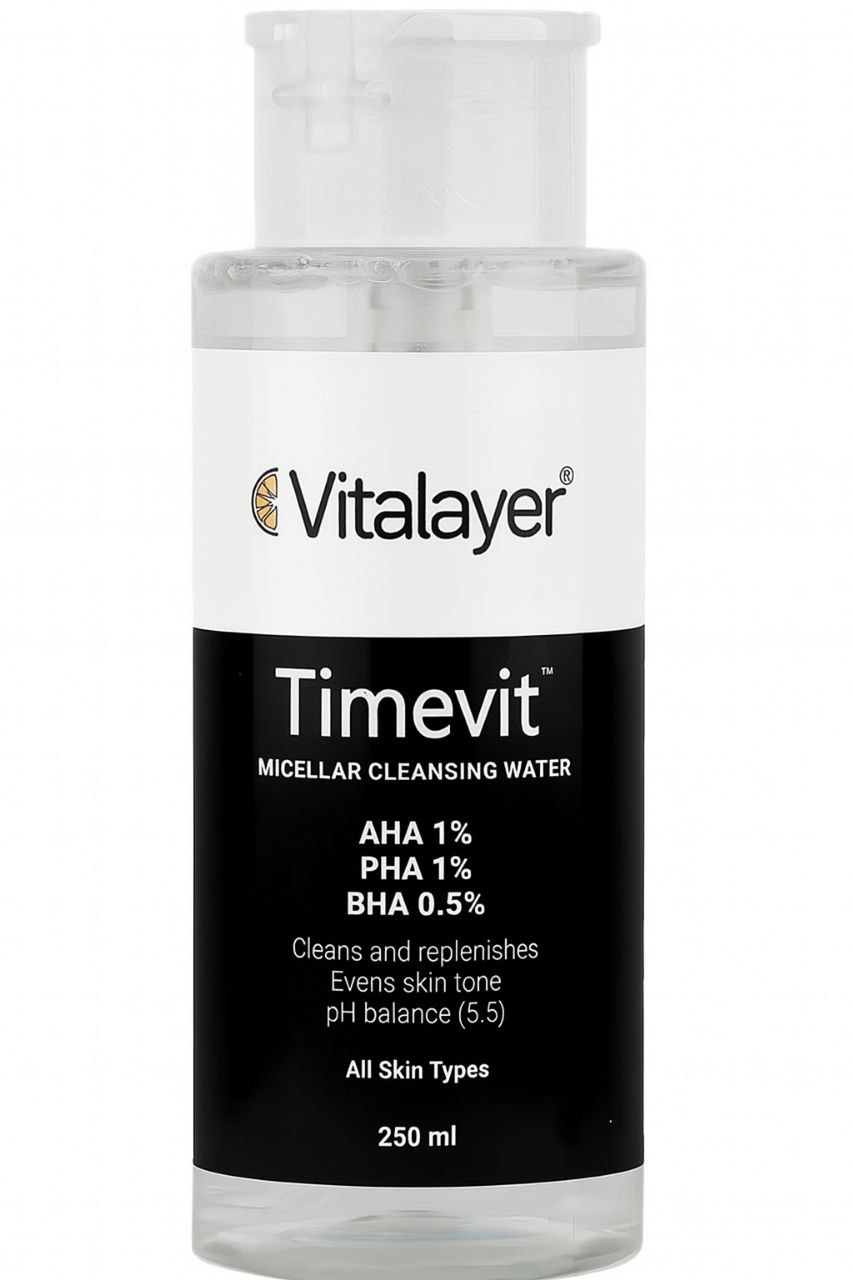 محلول پاک کننده میسلار واتر تایم ویت ویتالیر یکی از انواع میسلار واتر ویتالیر، محصولات ملایم و موثر برای پاکسازی پوست با لایه برداری ملایم در بسته بندی طوسی- مشکی است. میسلار واتر ویتالیر مشکی حاوی ترکیبات مختلفی است که به بهبود و شفافیت پوست کمک میکند.